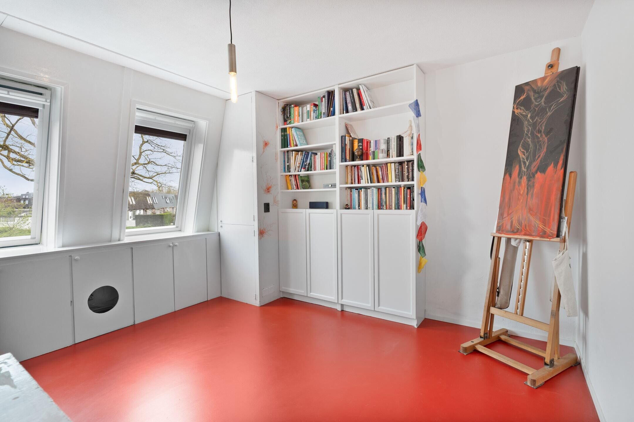 Wat deze woning extra bijzonder maakt, is de directe toegang vanuit de woonkamer tot de omgebouwde garage. Via een schuifdeur met glas-in-loodramen bereik je deze ruimte, die volledig is geïsoleerd en ingericht als werkkamer. Ideaal als kantoor aan huis, praktijkruimte of slaapkamer op de begane grond. Daarnaast zorgt een sfeervolle houtkachel voor extra warmte en gezelligheid.
