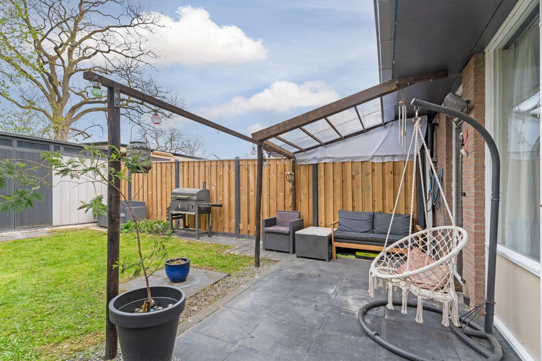 De voortuin is verzorgd aangelegd en ligt op het zuidoosten. Op de oprit is ruimte voor het parkeren van twee auto’s. Dankzij de hoekligging is de tuin breder dan gemiddeld. De achtertuin, gelegen op het noordwesten, is fraai aangelegd met een combinatie van bestrating, plantenborders en gras. Daarnaast beschikt de tuin over een berging en een achterom. Zowel in de voortuin als de achtertuin zijn buitenstopcontacten en wateraansluitingen aanwezig.